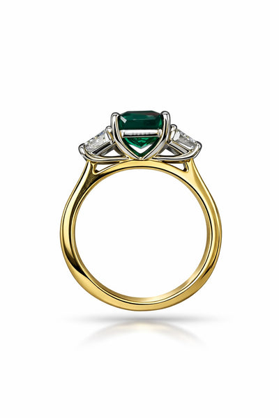 Another stunning ring crafted expertly in-house, this elegant three-stone ring showcases a striking radiant-cut lab grown emerald, set in refined claws to highlight its gorgeous, deep green colour. Flanked by two trapezoid-cut lab grown diamonds, the design offers a balanced silhouette with exceptional brilliance and symmetry. Finished with a polished 9ct yellow gold band and 9ct white gold setting for added contrast, the white gold claws aide in bringing out the glistening white of the diamonds. The setting features a classic gallery that elevates the centre stone while maintaining a graceful profile. Timeless yet distinctive, this ring is a sophisticated statement piece—perfect for an engagement, anniversary, or meaningful milestone.