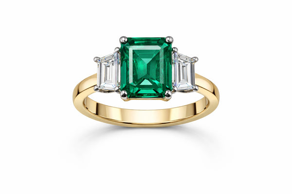 Another stunning ring crafted expertly in-house, this elegant three-stone ring showcases a striking radiant-cut lab grown emerald, set in refined claws to highlight its gorgeous, deep green colour. Flanked by two trapezoid-cut lab grown diamonds, the design offers a balanced silhouette with exceptional brilliance and symmetry. Finished with a polished 9ct yellow gold band and 9ct white gold setting for added contrast, the white gold claws aide in bringing out the glistening white of the diamonds. The setting features a classic gallery that elevates the centre stone while maintaining a graceful profile. Timeless yet distinctive, this ring is a sophisticated statement piece—perfect for an engagement, anniversary, or meaningful milestone.
